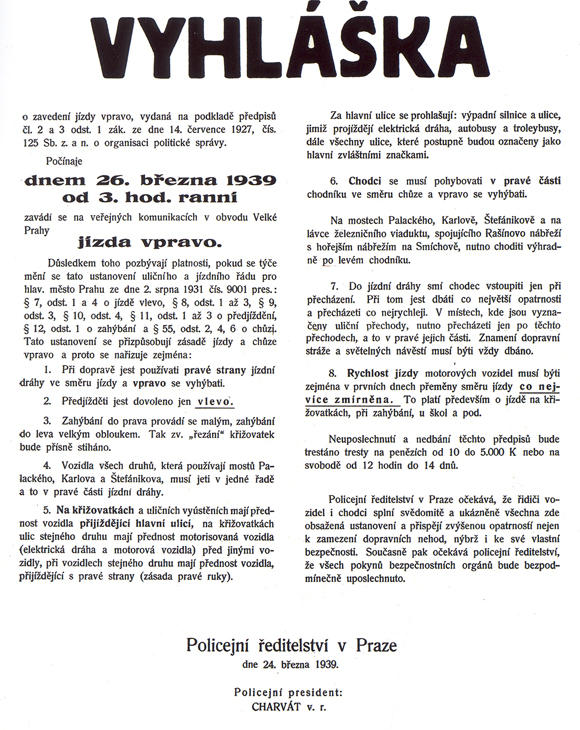 Po vstupu německých vojsk 15. března 1939 se však vše urychlilo. Wehrmacht byl zvyklý jezdit vpravo a 17. března vydal vrchní velitel Walther von Brauchitsch výnos, který přikazoval okamžitý přechod na pravostranný provoz v celém Protektorátu Čechy a Morava s výjimkou Prahy.
